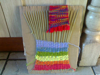 Take your cardboard and cut little 1cm slits along both edges of the short sides of your board, make sure that they are cut opposite each other so that when you wind your wool around to make the strings, they line up. Tie your wool/string on to the card and wind around and around until you have gone around your whole board. Then you can thread your needle and start weaving in and out the strands. Just remember when you come to the edge of a row to go around your last string and then look at your lines before and go the opposite way. If you went over before now you go under. Just keep alternating your rows and you’ll end up with a lovely pattern. When you want to change colours, just weave to the end of the row leaving some wool, cut the old colour and tie on the new one and off you go. Also remember to move your work down at the end of each row or two or you will get gaps. You can use a pencil for this. When you are finished weaving you can cut your strings. Cut them quite far away from the weaving and then take two strings and tie a knot. Keep moving along tying two strings all along until you are finished. Enjoy!